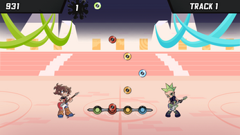 Notes fall top-to-bottom — a familiar, fast-paced rhythm format